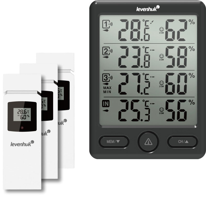 Levenhuk Wezzer PLUS LP20 weather station measures temperature and humidity simultaneously at four locations. It is a very convenient tool for monitoring the weather changes and the microclimate in several rooms, for example, in the buildings on the land parcel. The base of the weather station measures the temperature and humidity at its installation location and can be mounted on the wall or placed on a flat surface. Three wireless remote sensors transmit the data to the base station via a radio link. They can be mounted on the walls up to 30 meters (98 feet) from the base.