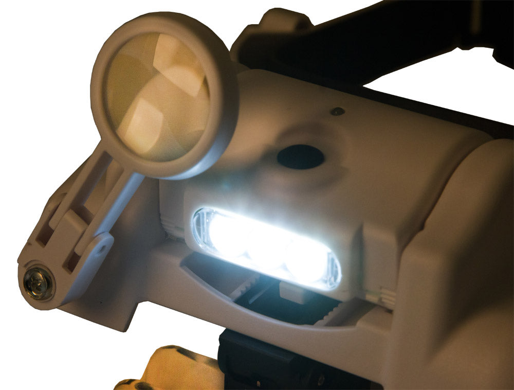 Interchangeable lenses and a swivel lens for the right eye. Battery-powered LED illumination. Magnification: 1x/1.5x/2x/2.5x/3.5x/8x