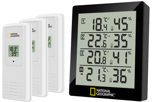 The National Geographic thermo-hygrometer offers the possibility to measure temperature and air humidity in or around your house at 4 different locations, with simple monitoring at one location: Is my cellar room too moist and threatened by mould? Is the children’s bedroom temperature all...- €40.94 EUR