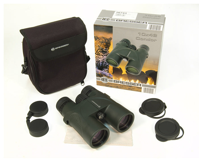 Universal Bresser Condor 10x42 Binoculars – small, lightweight, and waterproof model with 10x magnification and high-quality optics. This model is great for travelers who like to both visit museums and observe nature or sports events. The 3-meter close focus of this model allows you to observe objects that are really close to you. Conveniently, the attached objective lens caps won’t ever get lost.