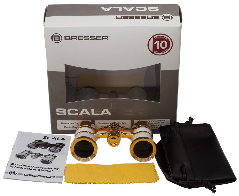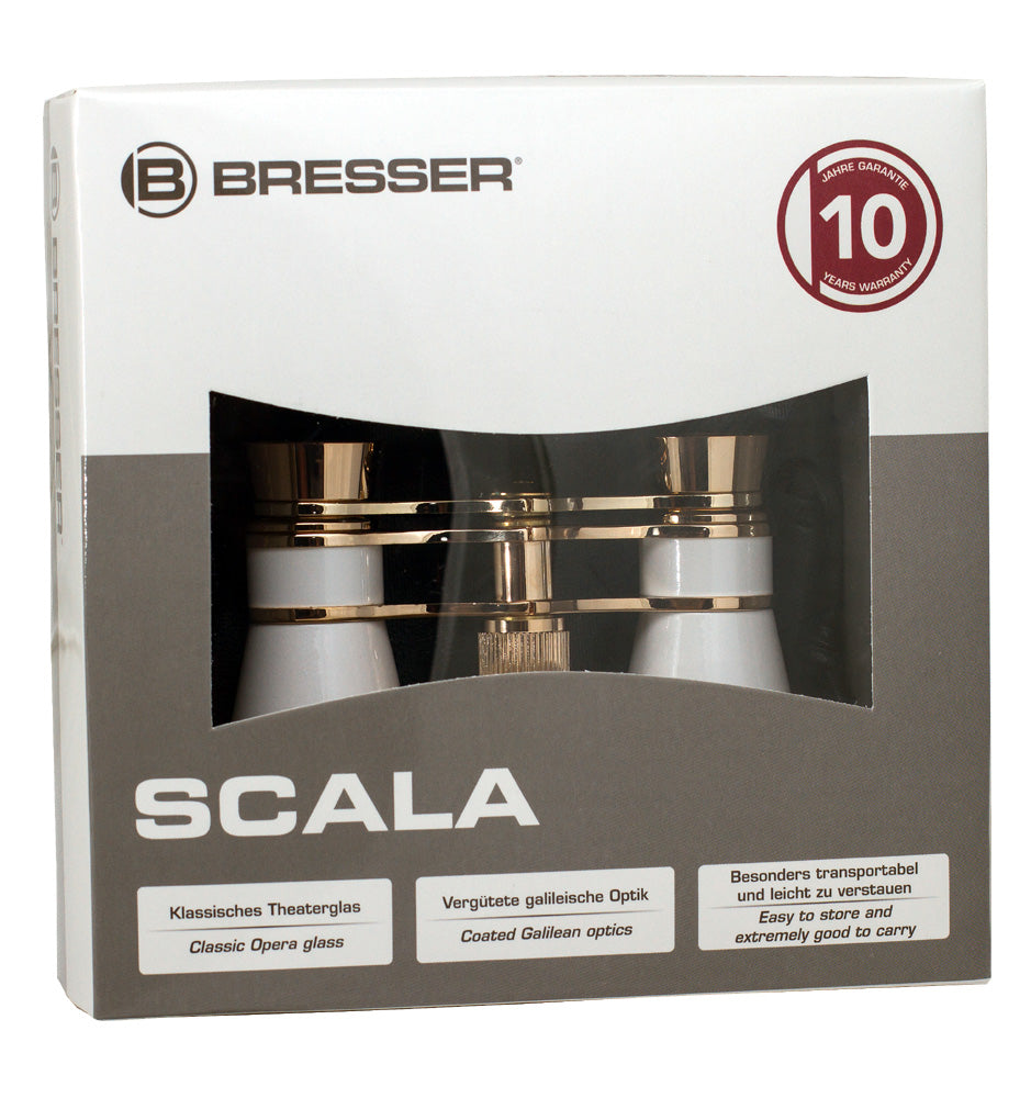Bresser Scala MPG 3x25 Opera Glasses are traditional theatre binoculars with Galilean optical design. The lenses are made of high-quality BK-7 optical glass and are fully coated with anti-reflective coating, which makes the image always bright and clear. For quick sharpness adjustment, use the central focusing wheel. The compact dimensions of the device allow you to keep it in a small purse.