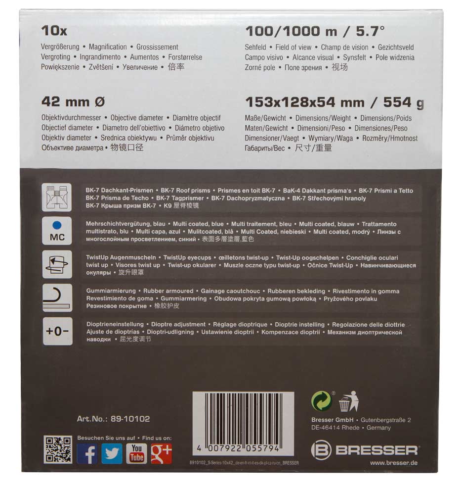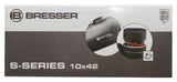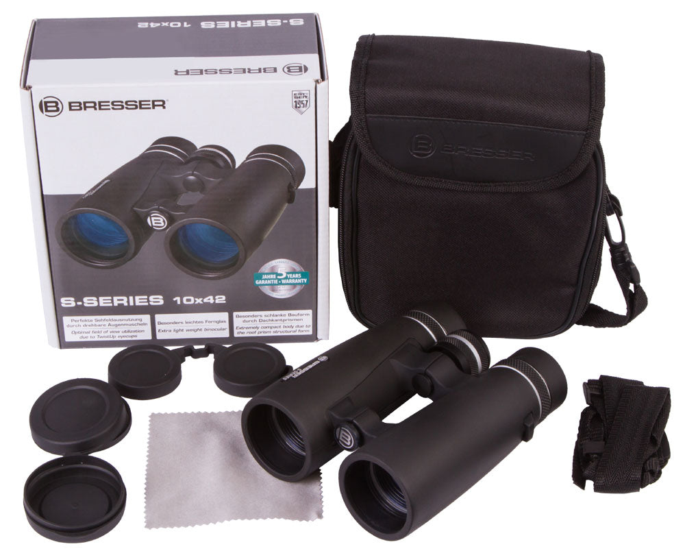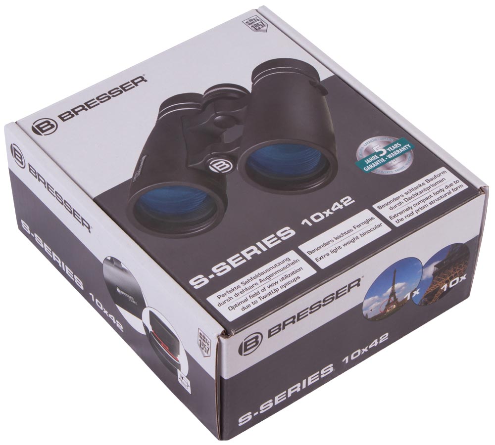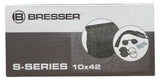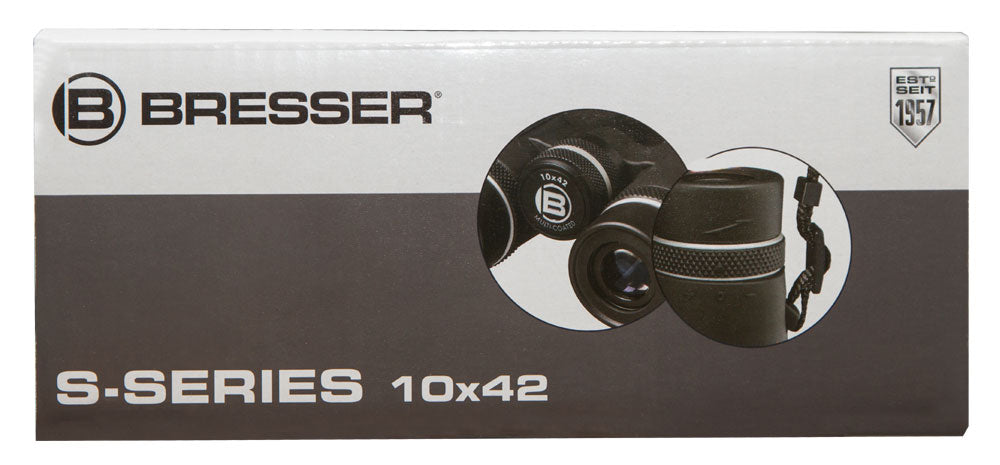 The Bresser S-Series 10x42 is a roof prism binocular with a magnification of 10x and an optical aperture of 42mm. A diopter adjustment allows diopter corrections up to +-2. A high quality multilayer coating on all glass elements reduce distracting reflections and improves the light transmission and provides a high contrast also in bad light conditions. The binocular is build with a handy and stain resistant rubber surface. Due to the light weight body of only 554g it is easy to handle and to carry. For better transport a bag and a comfort strap is included in the delivery.
