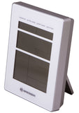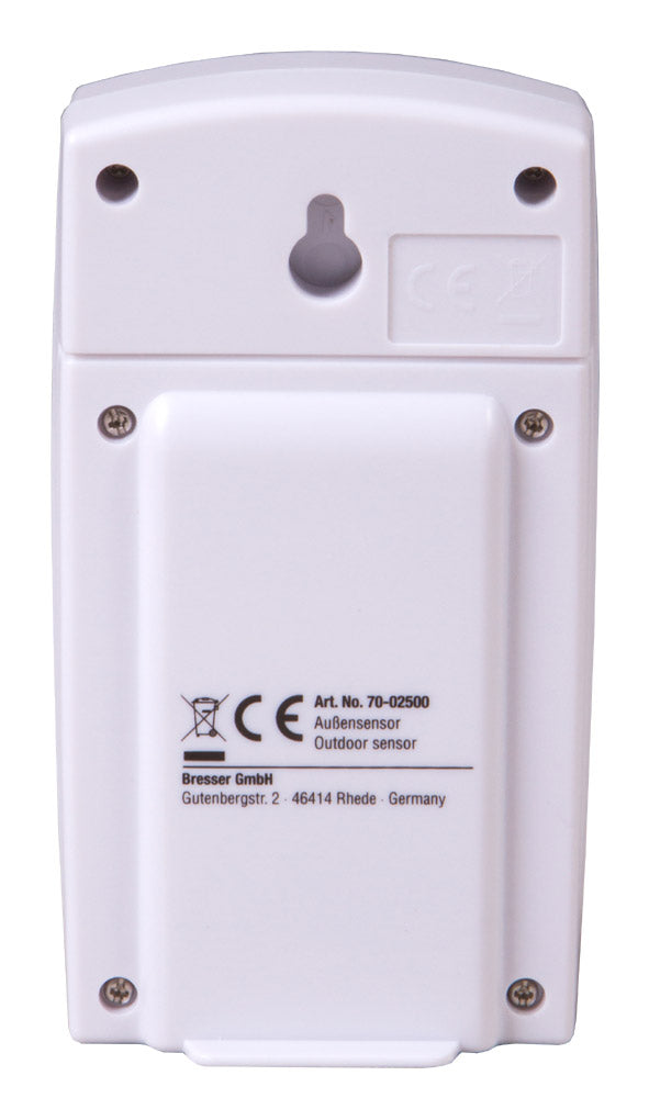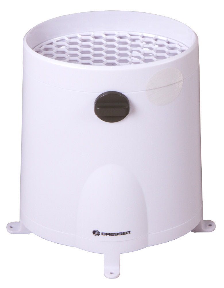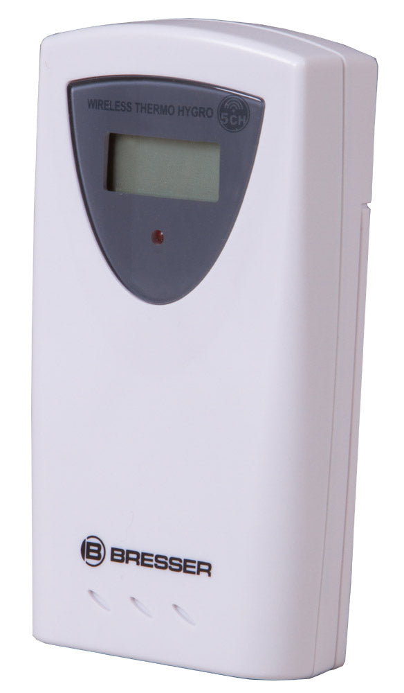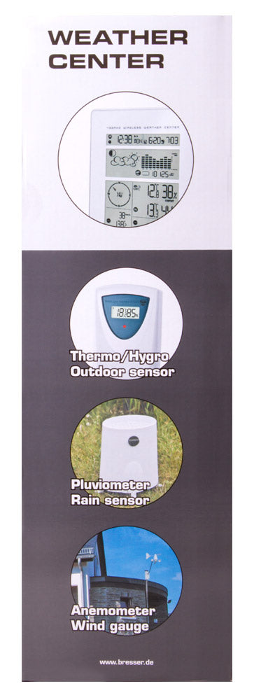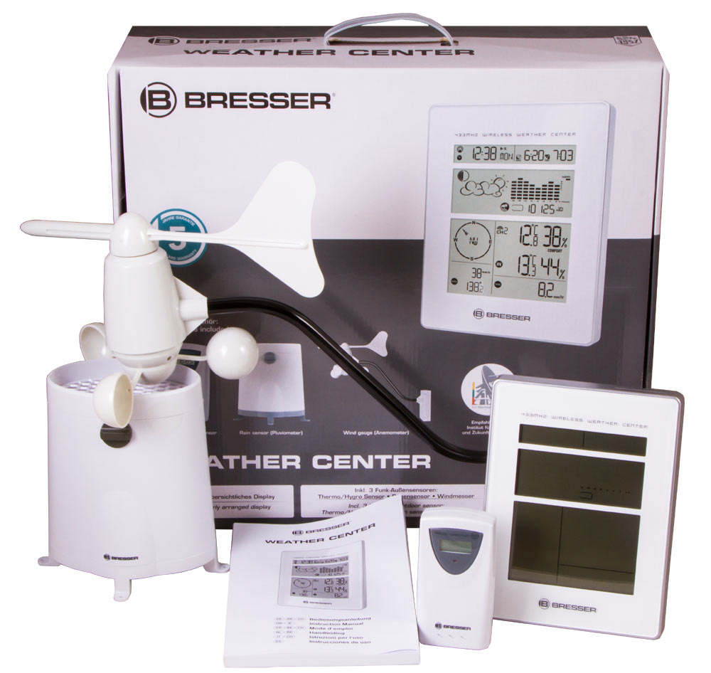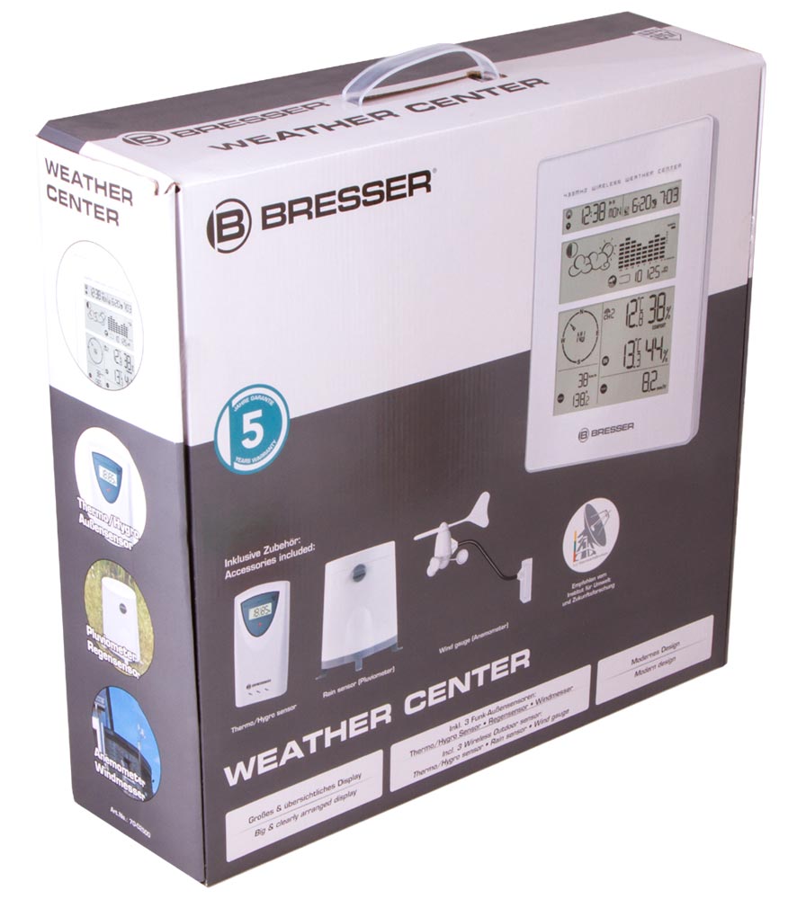 Bresser RC Weather Station is a radio-controlled weather station in a modern design. Radio-controlled clock and date display, pluviometer, anemometer, thermo/hygro sensor with temperature and air humidity display for indoor and outdoor. Air-pressure, moon phases and sunrise and sunset display, integrated storage for min. and max. data. All external sensors send the data via 433MHz with a distance up to 100m.