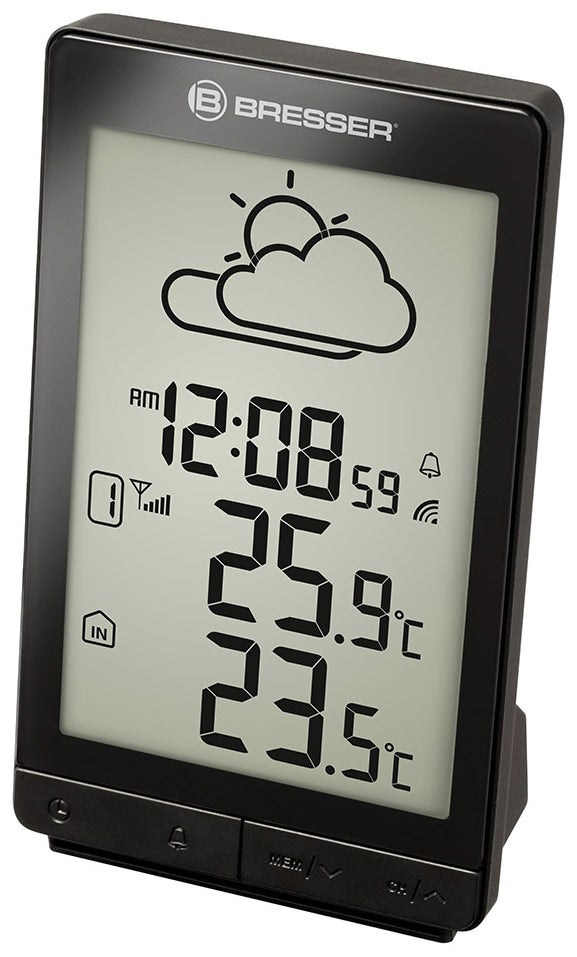 The Bresser TemeoTrend STX radio-controlled weather station shows on a clearly structured display next to the current time, which is transmitted via DCF radio signal, also information on indoor and outdoor temperature.