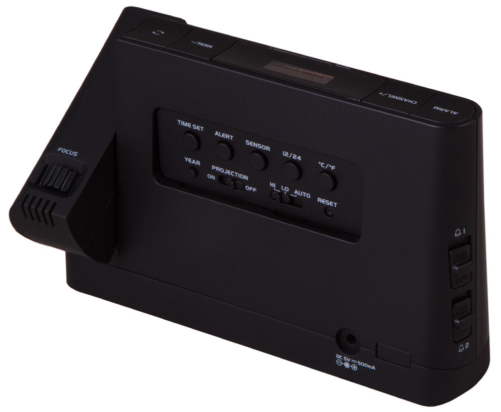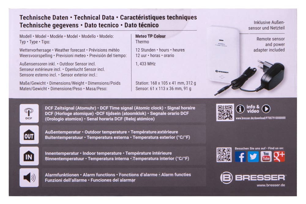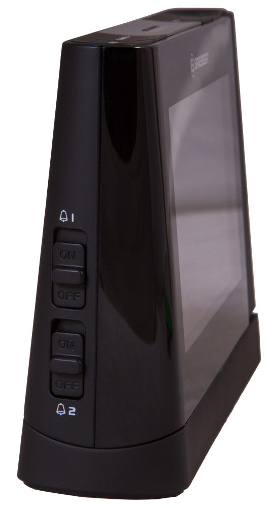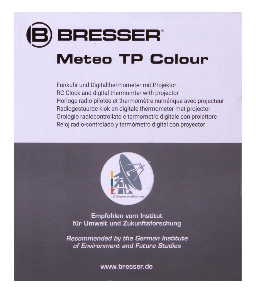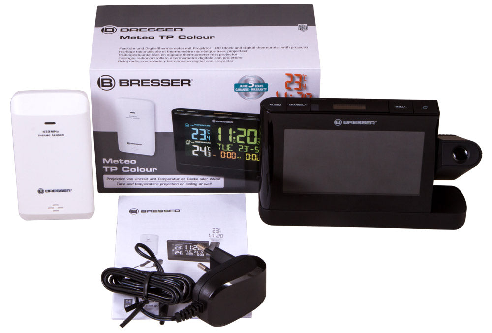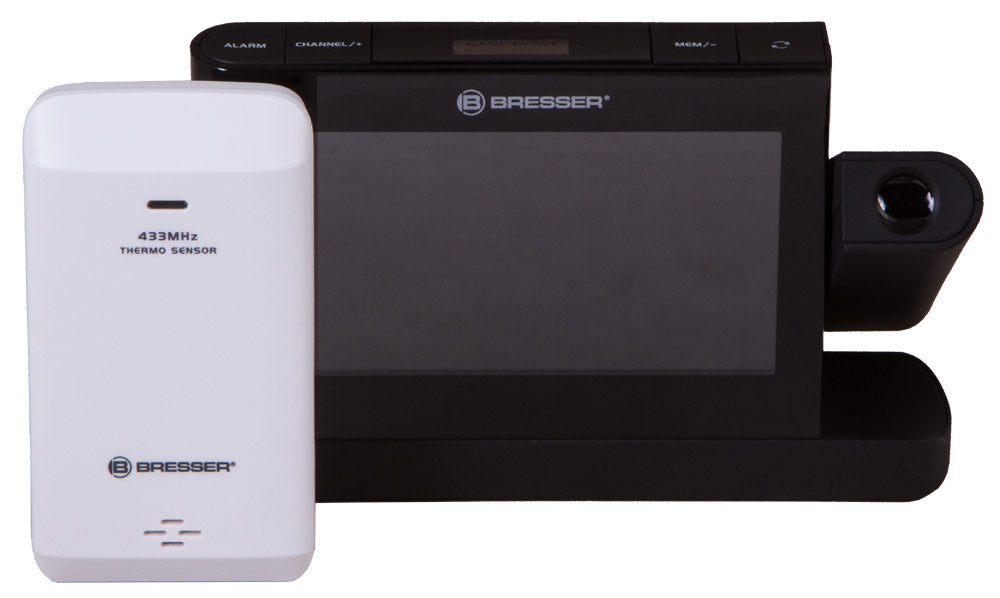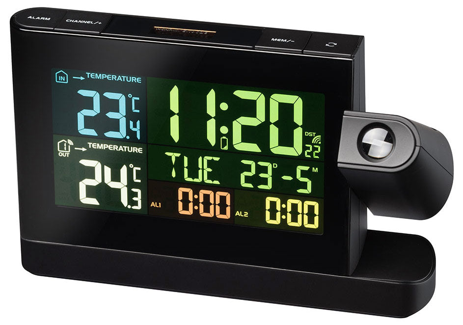In addition to the time, which is automatically transmitted by radio signal, the projection clock also supplies information of the inside/outside temperature (1x external sensor included in the kit) as well as the current weekday and date. Up to 8 outdoor sensors can be connected to the weather station (purchased separately). With the integrated dual alarm function, you can also use this weather station by Bresser as an alarm clock.