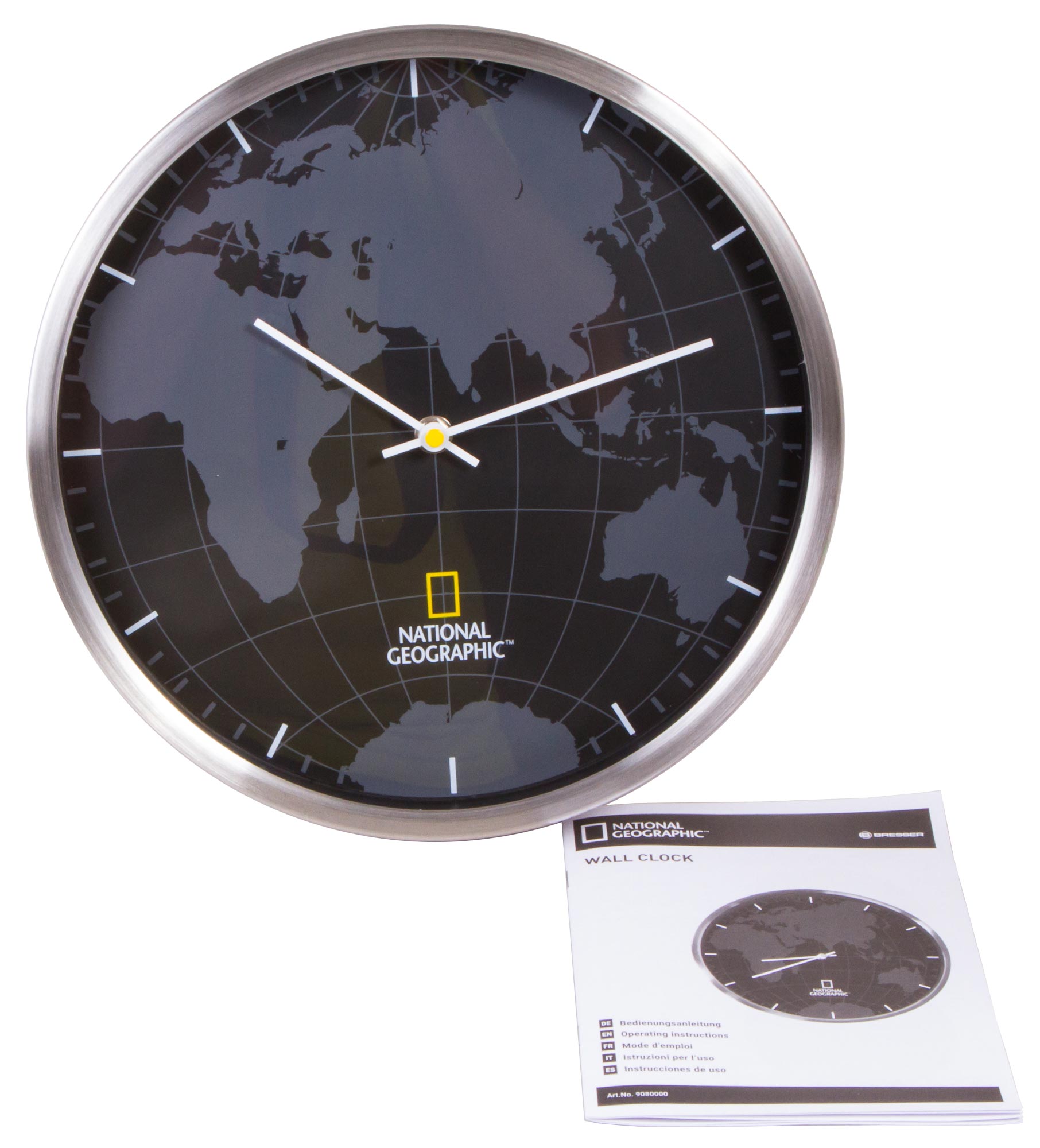 The National Geographic wall clock with its brushed aluminium frame and the discreet black and grey world map fits perfectly in every living room. Thanks to the silent clockwork it can also be placed in your bedroom, without you waking up at night because of an annoying tick tock.