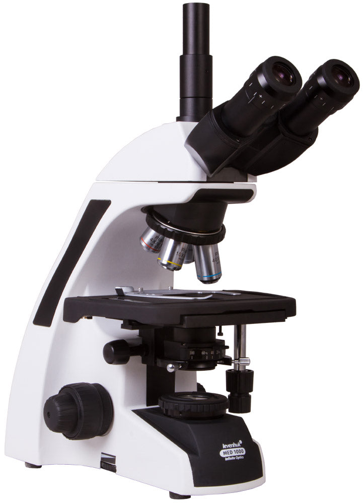 Levenhuk MED 1000T is a trinocular optical microscope with plan achromatic objective lenses; setting up the Köhler illumination is available.