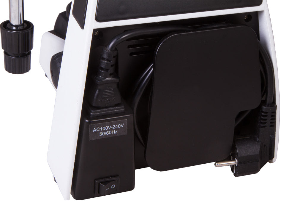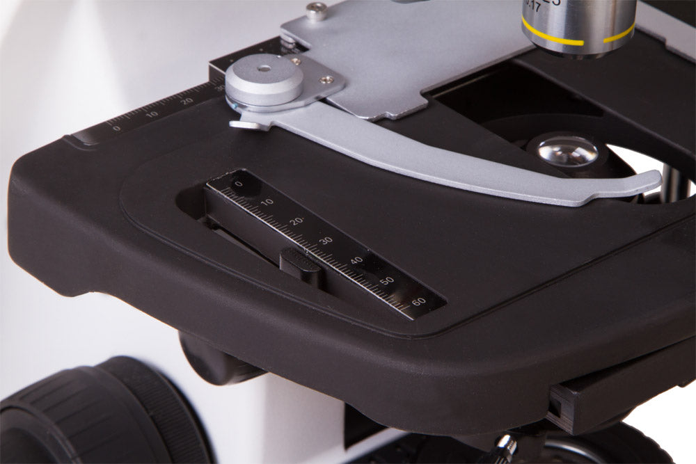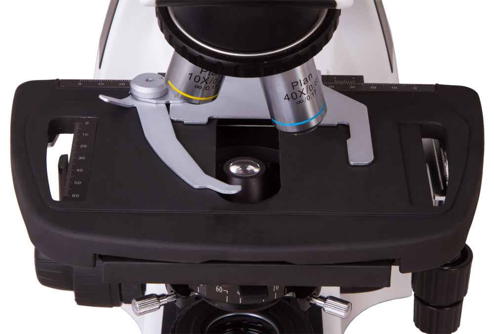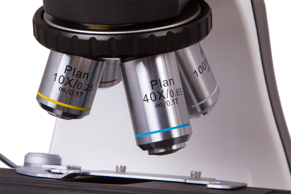 The main feature of this microscope is its optics. The revolving nosepiece includes four plan achromatic objective lenses that improve color rendering, reduce spherical aberrations, correct the field curvature (total square of the flat field of view is up to 95% diameter of the observed image). A 100x objective lens allows for observations using oil immersion. The microscope magnification range is from 40x to 1000x.