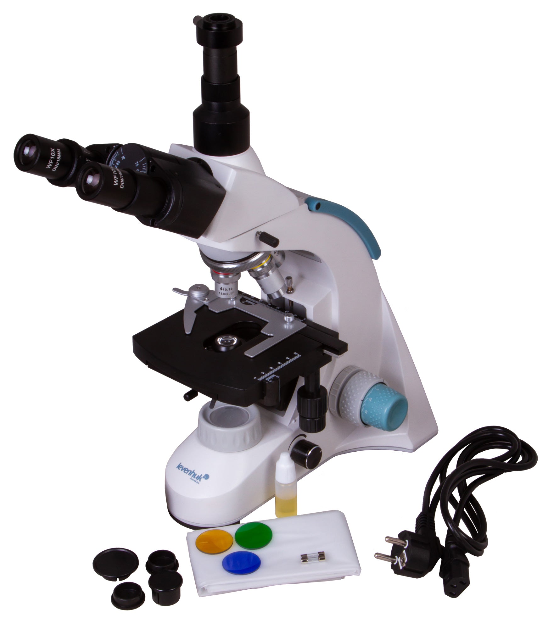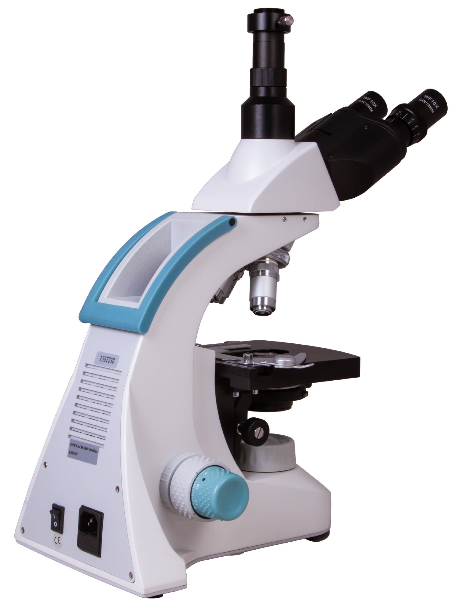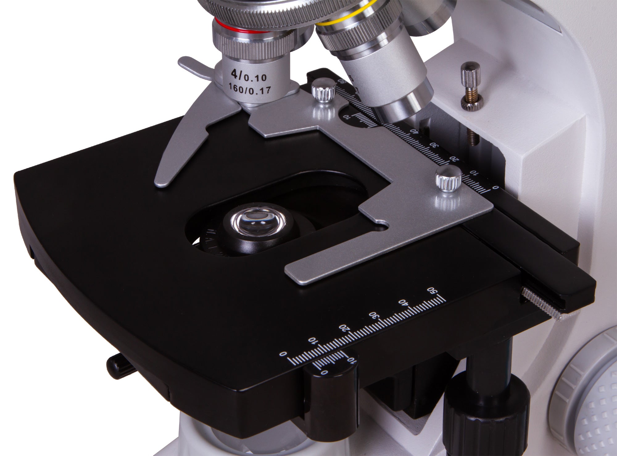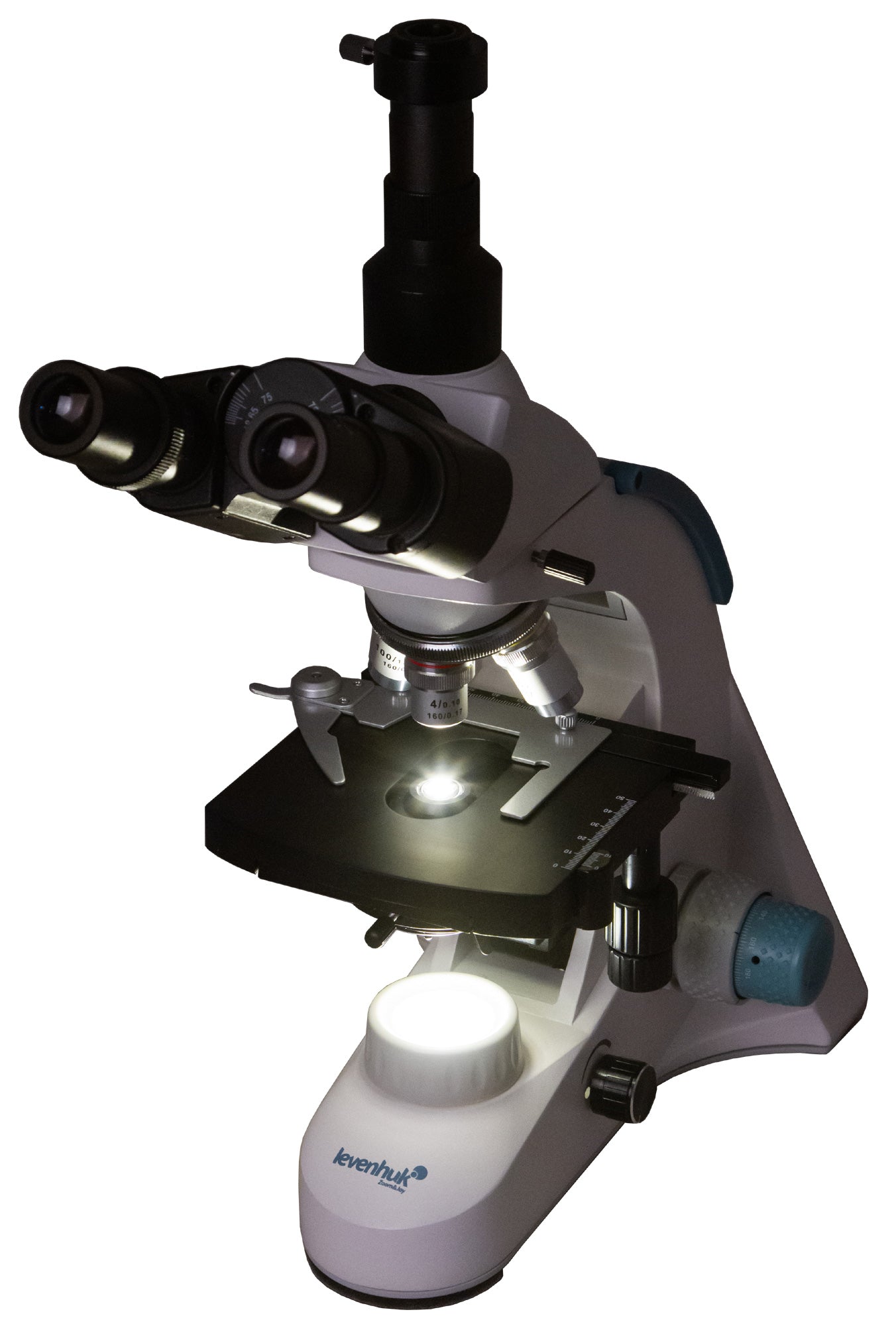 The microscope stage is equipped with a mechanical scale. Under the stage, there is an Abbe condenser with an iris diaphragm and a filter holder. Powerful LED lighting is supplemented by a collector, the brightness of the lighting is adjustable. AC power is used for the power supply.