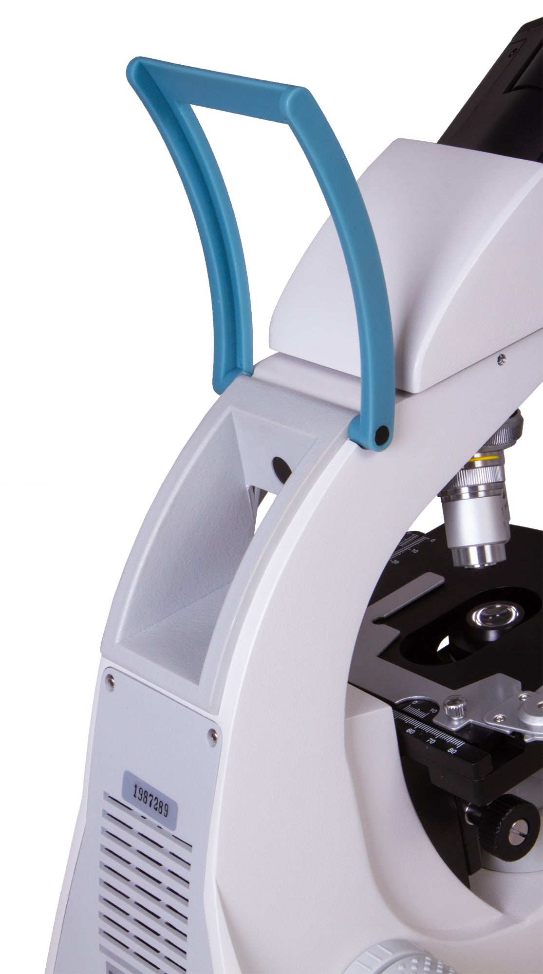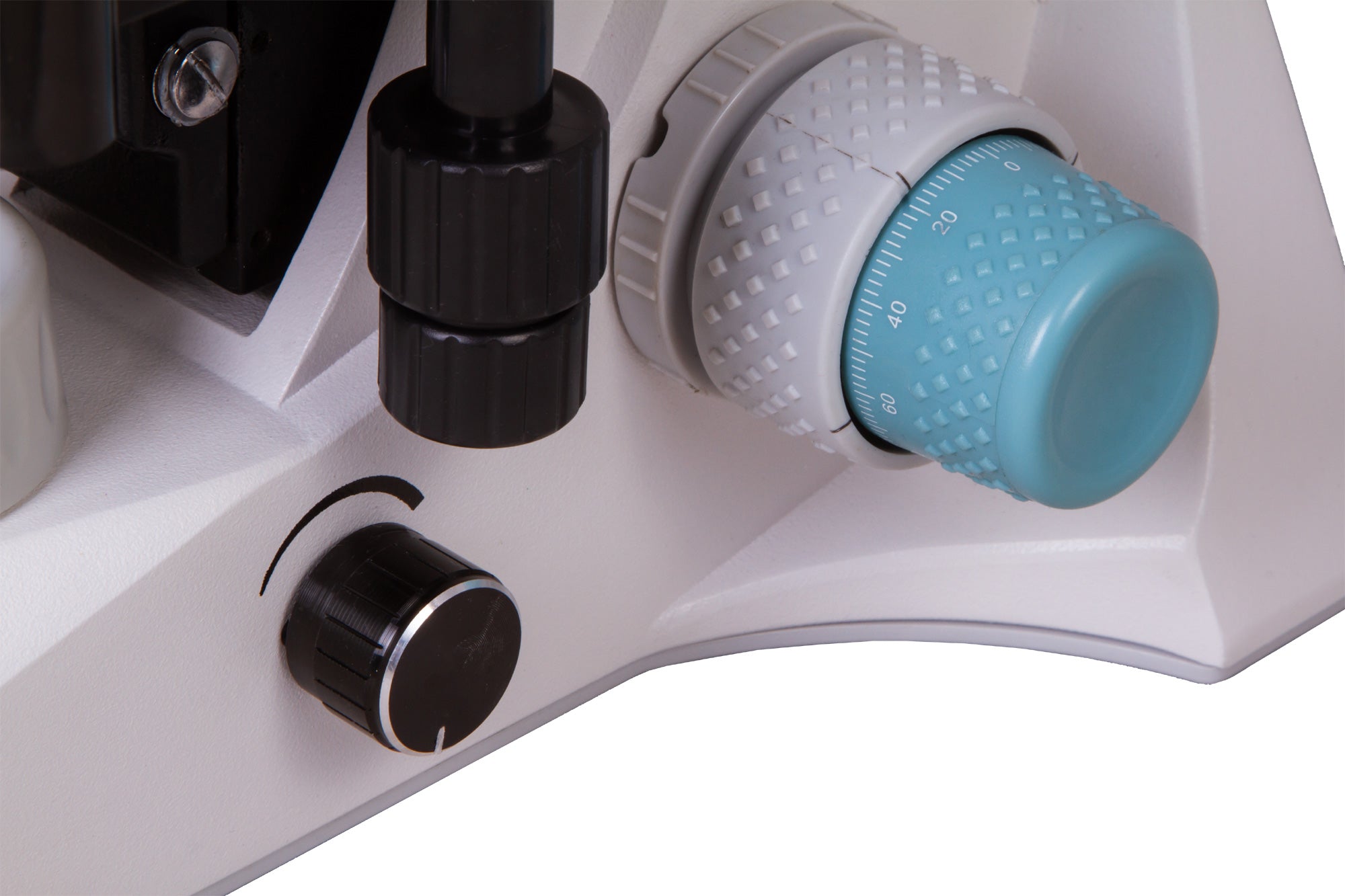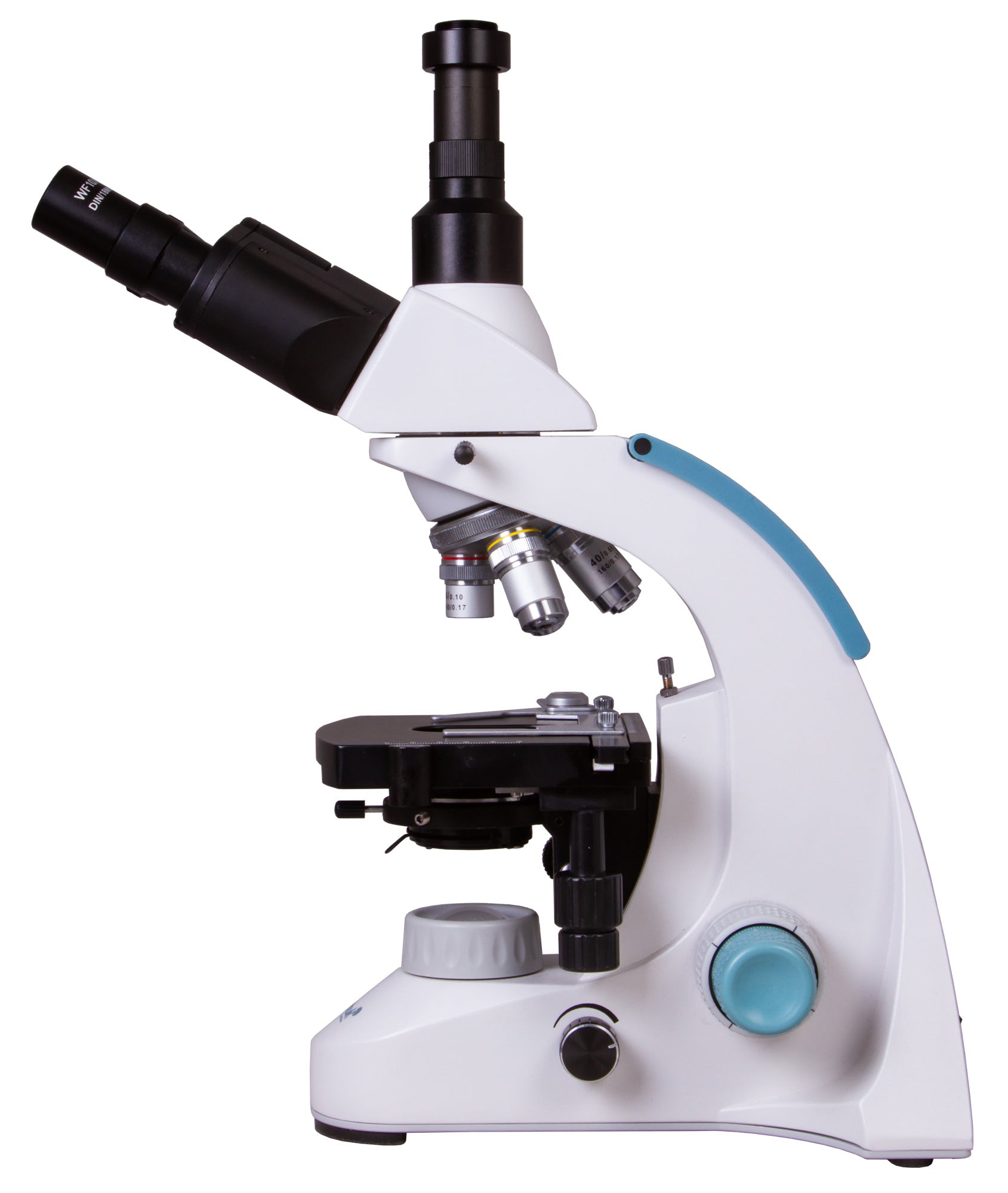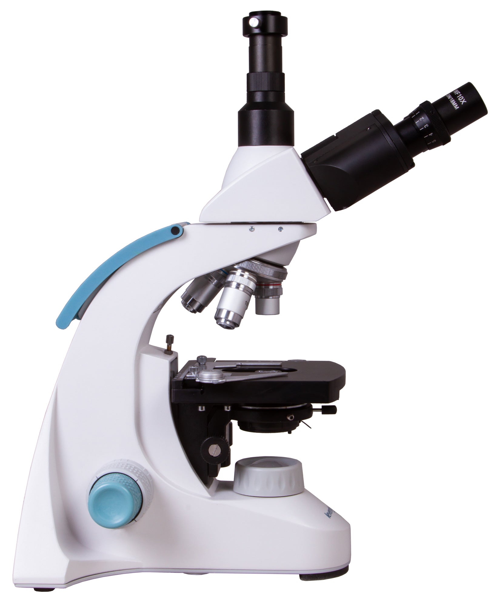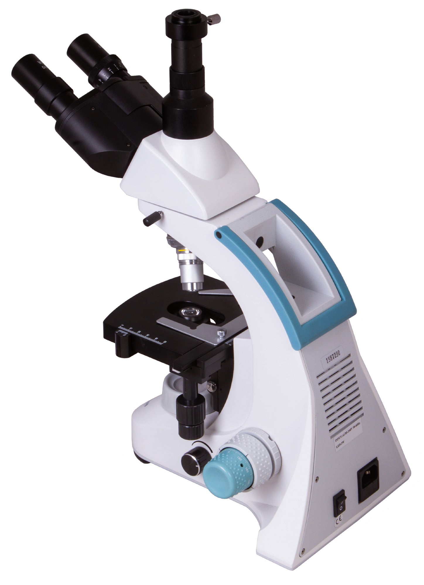 The microscope stage is equipped with a mechanical scale. Under the stage, there is an Abbe condenser with an iris diaphragm and a filter holder. Powerful LED lighting is supplemented by a collector, the brightness of the lighting is adjustable. AC power is used for the power supply.