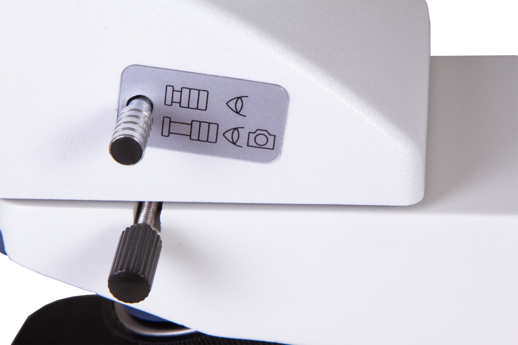 A trinocular head consists of an ocular tube for installing a digital camera (not included), and a binocular head for visual observations. A 30° inclination angle is convenient for lengthy work, and a 360° rotatable head allows for the effective use of the microscope for group work. There is a beam splitter.