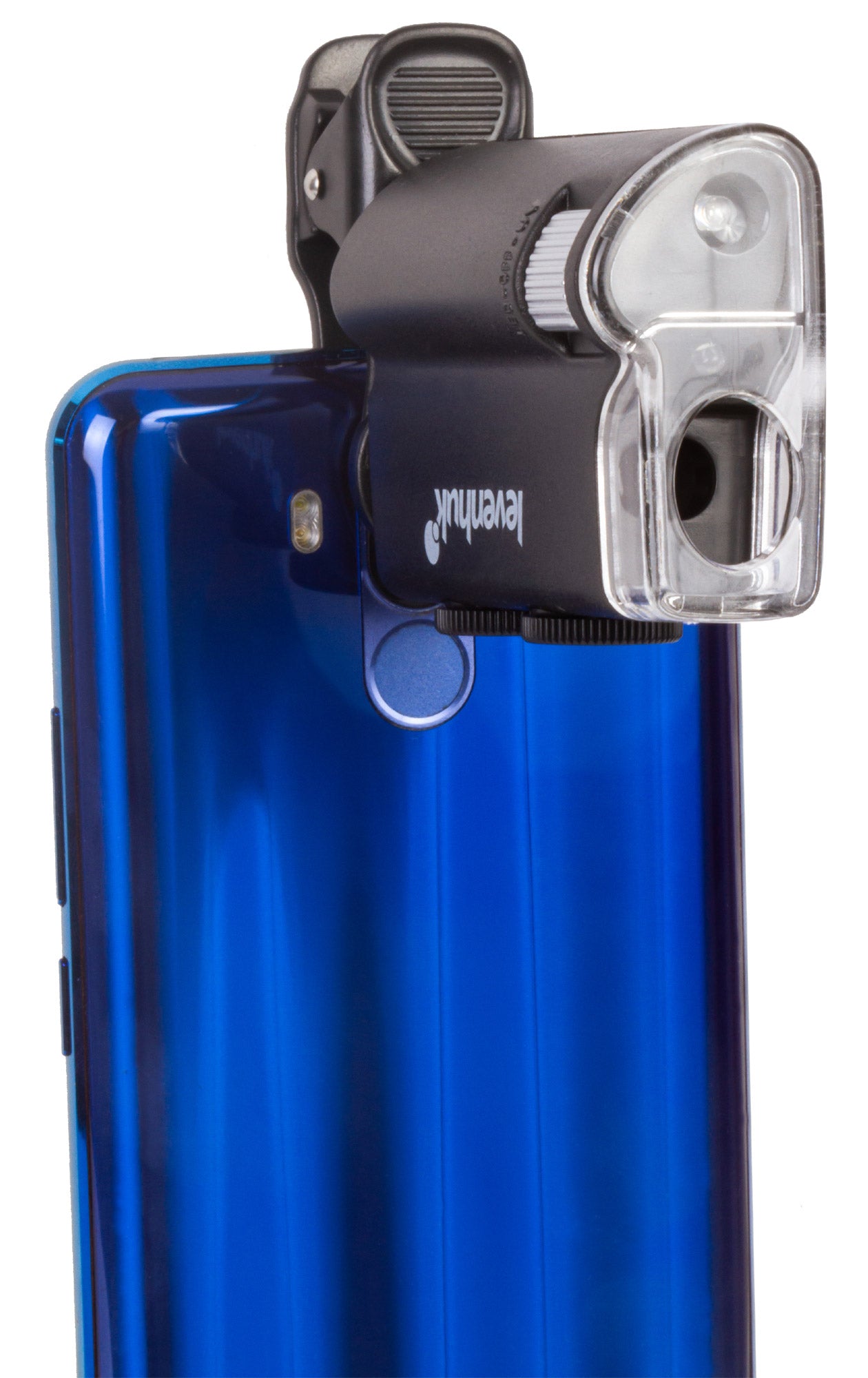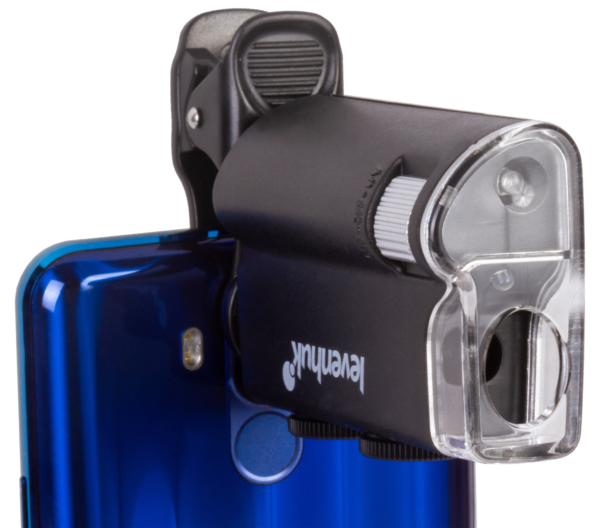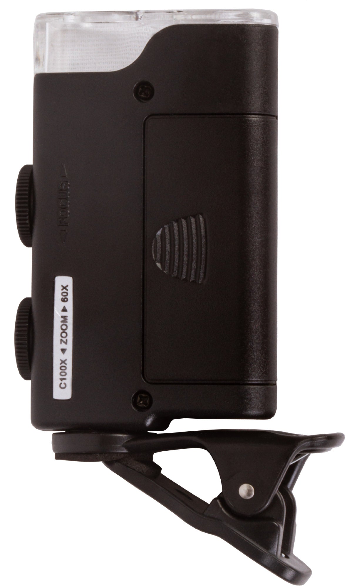 Pocket microscope with a clip for attaching a mobile device